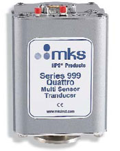The HPS® Series 999 Quattro™ Vacuum Transducer from MKS Instruments combines all the pressure sensing technology required by today's advanced vacuum tools into one compact package with a single electronic interface. With absolute measurement between 10-10 and 1,000 torr and differential measurement between -760 and 760 Torr for atmospheric switching capabilities, the Quattro transducer uses several different technologies to provide highly accurate measurement in one smoothed output.A single HPS® Series 999 Quattro™ transducer has the ability to replace multiple sensors in a vacuum system, including: ionization and Pirani gauges, sub-atmospheric and atmospheric pressure measurement gauges, differential pressure gauges, and both differential and absolute pressure switches. This enables the end-user to save time, money, and valuable tool space. The self-calibration feature reduces maintenance and improves repeatability.