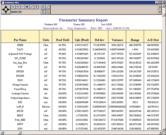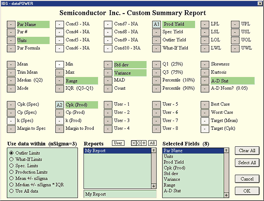 The Custom Summary Report makes more than fifty statistics available to summarize data. These are selectable in any combination and in any sequence. Reports can be saved in the database, and sorted on any field. Included are common descriptive statistics (mean, standard deviation, min., max., etc.), robust statistics (trimmed mean, quantiles, MAD), normality checks (skewness, kurtosis, Anderson-Darling test statistic), production statistics (capabilities, limits, margins, yields), as well as user-definable functions for additional flexibility. Custom report configurations can then be saved for later use. All saved report types can be run in batch mode.