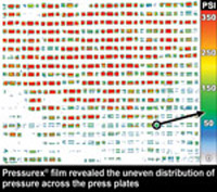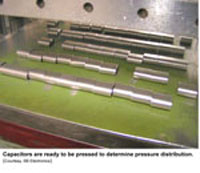 Bryan inserted the Pressurex, which he had ordered in Super Low pressure range of 70--350 PSI (5--25kg/cm2), between the press plates during a product run and saw the uneven distribution of pressure between the capacitors. "As a result, I could prove the press plates weren't flat and were causing uneven pressure distribution," said Bryan. "This was of great value to us."